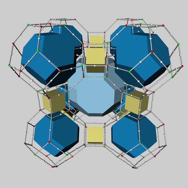 Kristalstructuur van zeoliet type A (blauwe en gele vormen vullen de holtes)